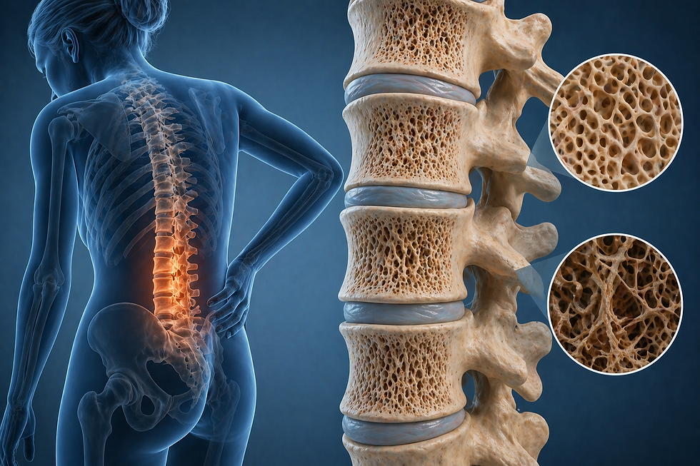 Osteoporose i korsryggen er en systemisk skjelettsykdom som gir redusert benmasse og svekket struktur i virvlene i columna lumbalis. Patofysiologisk sees ubalanse i benremodellering med økt osteoklastaktivitet og redusert osteoblastfunksjon, som fører til tap av trabekulært bein og redusert styrke. Tilstanden utvikles ofte med økende alder, hormonelle endringer (særlig østrogenmangel), inaktivitet eller ernæringssvikt. Rammer hyppigst postmenopausale kvinner og eldre menn. Debuten er ofte asymptomatisk til kompresjonsfrakturer oppstår, med akutte eller gradvise korsryggsmerter, redusert høyde og økt kyfose.